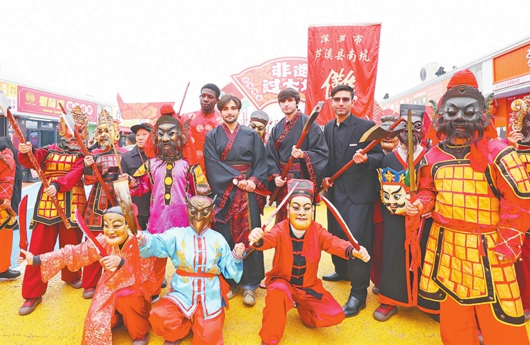 | 1月22日,在萍乡经济技术开发区,外国留学生现场体验芦溪南坑车湘傩舞。芦溪南坑车湘傩舞是省级非物质文化遗产代表性项目。通讯员 吴 伟摄 |