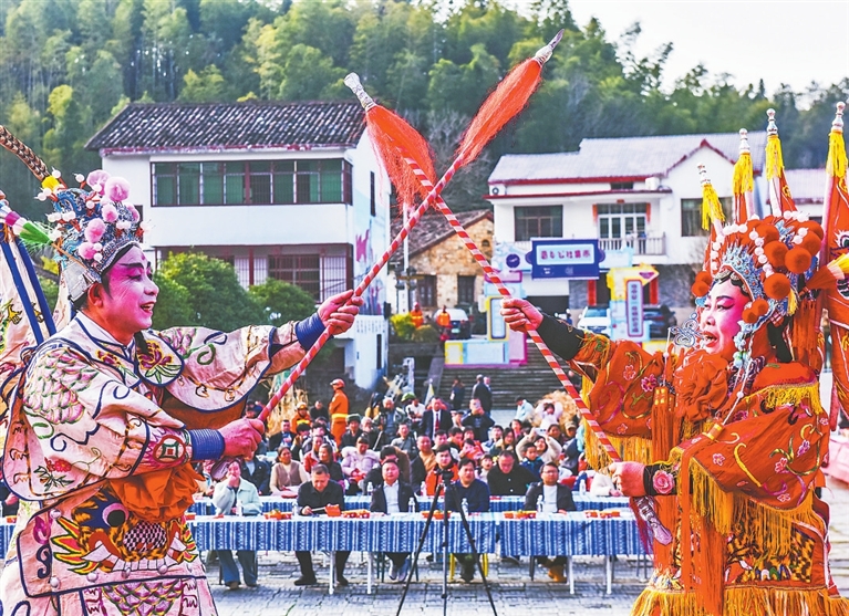 | 1月22日,资溪县乌石镇,经典赣剧《穆桂英挂帅》表演赢得村民们阵阵叫好。特约通讯员 吴志贵摄 |