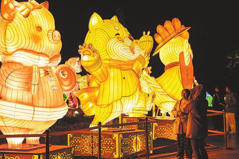 1月25日,游客在赣州市章贡区方特东方欲晓主题公园内欣赏花灯,各式花灯流光溢彩、璀璨夺目。