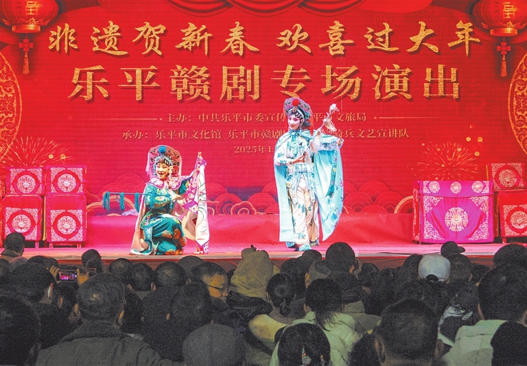 1月30日晚,赣剧《杨八姐游春》在乐平市洎阳街道飞仙桥社区老北街古戏台精彩上演。本报全媒体记者 徐 铮摄
