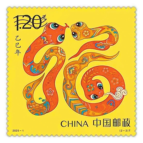 乙颂初阳岁,巳迎多福春。2025年,是农历乙巳年,即蛇年。1月5日,中国邮政发行《乙巳年》特种邮票1套2枚,图案名称分别为“蛇呈丰稔”“福纳百祥”。这是中国邮政发行的第四轮生肖蛇票,由潘虎、张旺联合设计。