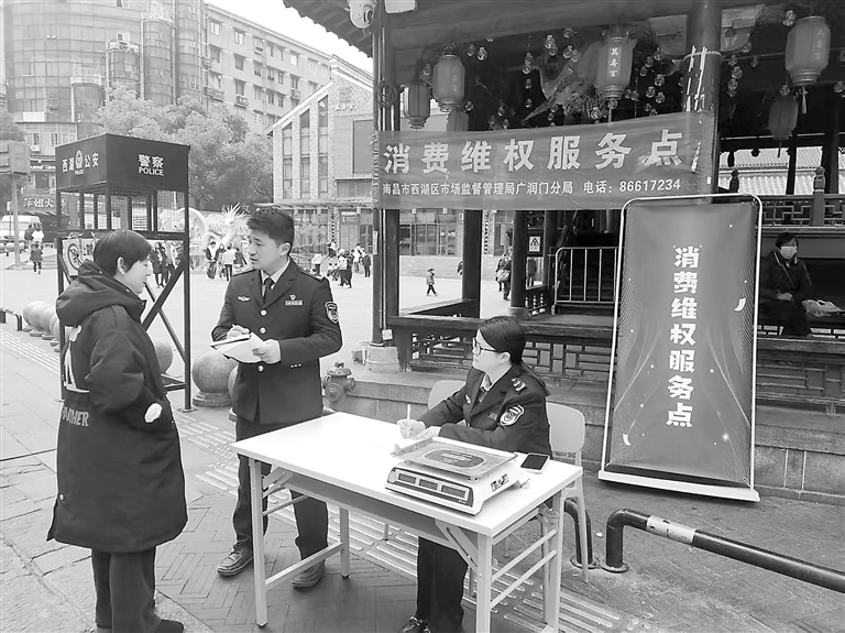 西湖区市场监督管理局广润门分局负责人介绍:“这个春节,我们分局将假期线下留守工作人员增派至3人,其他监管干部均作为机动力量随时待命,以‘时刻在现场’的姿态积极营造放心消费环境,擦亮万寿宫历史文化街区消费维权服务品牌,以‘小点位’守护‘大街区’”。