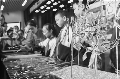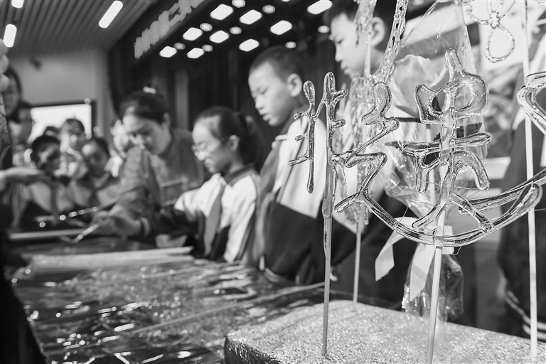 ◀24日,在吉林省第二实验朝阳学校,学生们学习制作糖画。
