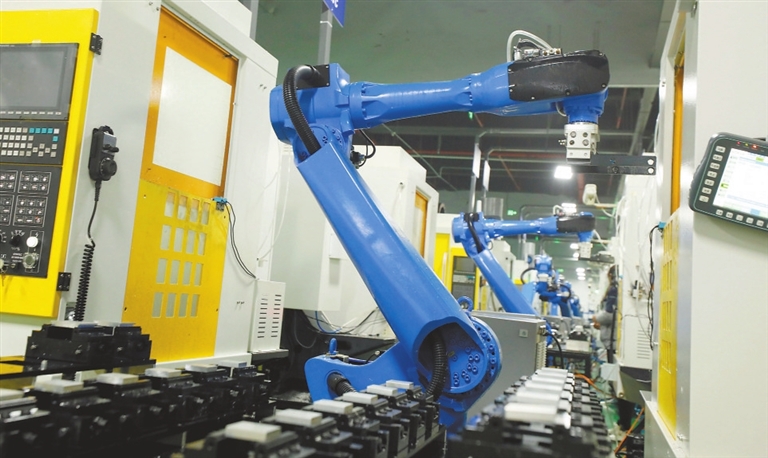 2月20日,位于泰和高新区数字产业园的吉安法拉制造智能科技有限公司数字化车间内,智能机械手臂正在生产线上作业。特约通讯员 邓和平摄