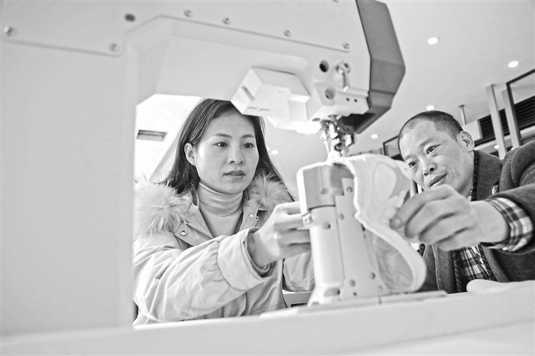 2月24日,在石城县工匠联盟名匠工作室,制鞋师傅指导新学员操作针车,帮助学员顺利掌握制鞋技能。特约通讯员 温京燕摄