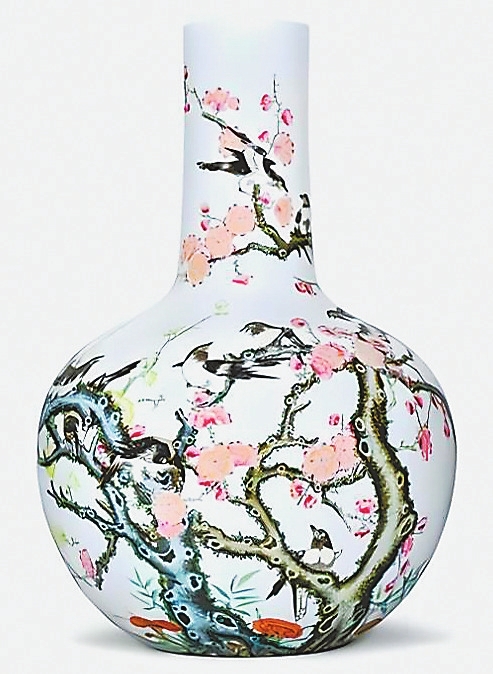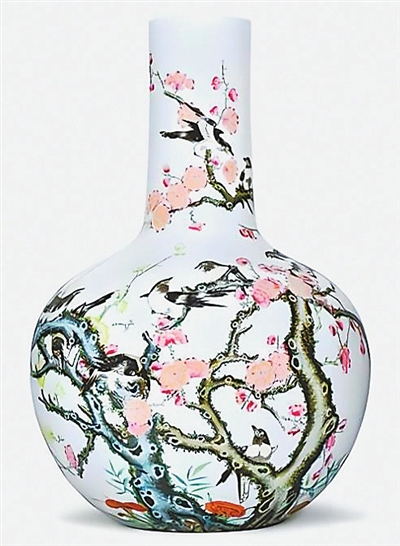 在众多的瓷器收藏品类中,粉彩瓷相对低调而出彩。笔者近日在藏友处,欣赏到了一件民国粉彩喜鹊登梅天球瓶(下图)。该天球瓶高39厘米,瓶身以粉彩绘就“喜鹊登梅图”,整幅画面和谐优美和喜庆。图中喜鹊形态各异,或展翅高飞,或栖息枝头,像是叽叽喳喳在传递着喜讯;梅花绽放,枝干苍劲,傲雪凌霜,展现出顽强的生命力。