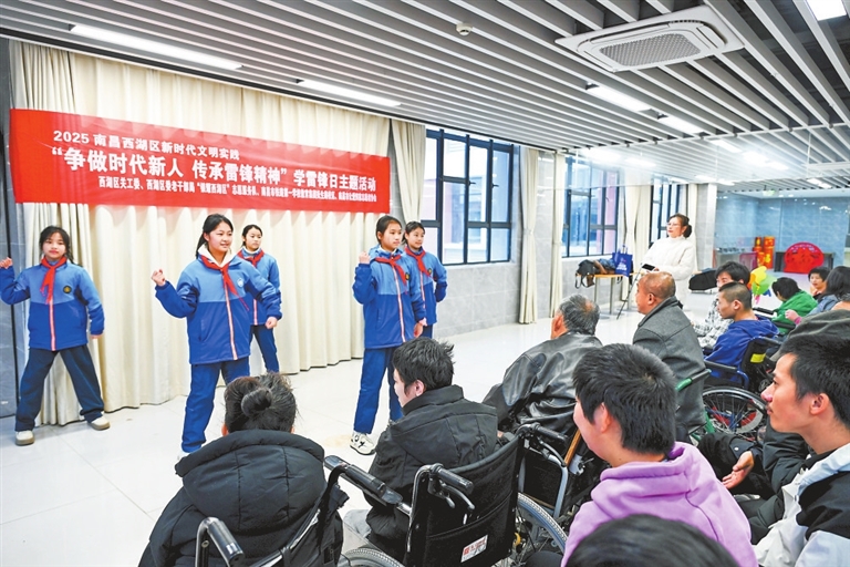 3月3日,南昌市铁路第一学校教育集团抚生路校区学生走进南昌市社会福利院,开展“争做时代传人,传承雷锋精神”学雷锋日主题活动。图为学生为社会福利院的老人和孩子们表演节目。通讯员 梅慧子摄
