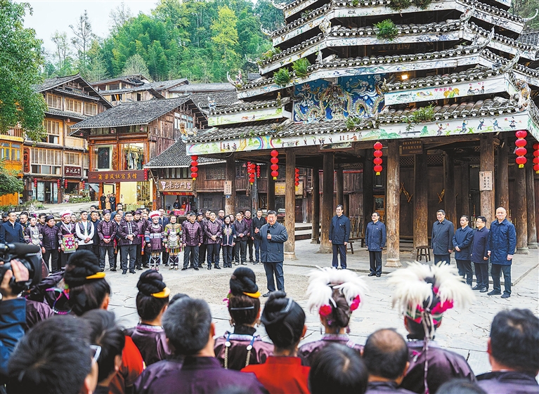 17日下午,习近平来到黔东南州黎平县肇兴侗寨考察。寨门口,身着民族盛装的村民唱起侗族大歌欢迎总书记。习近平饶有兴致地听取侗族大歌的艺术起源、曲调特点、演唱形式等方面介绍。随后,沿着村寨路道察看侗寨风貌和旅游商铺,不时驻足与店主、游客、村民互动交谈。在侗族文化展示中心,他详细了解侗族历史、风俗和服饰、建筑等特色文化保护传承情况。在侗乡特色产业基地,他观看蜡染工艺流程,对蜡染合作社坚持顾客至上、质量第一的运营理念给予肯定。习近平指出,少数民族文化是中华文化不可或缺的组成部分,既要保护有形的村落、民居、特色建筑风貌,传承无形的非物质文化遗产,又要推动其创造性转化、创新性发展,让民族特色在利用中更加鲜亮,不断焕发新的光彩。