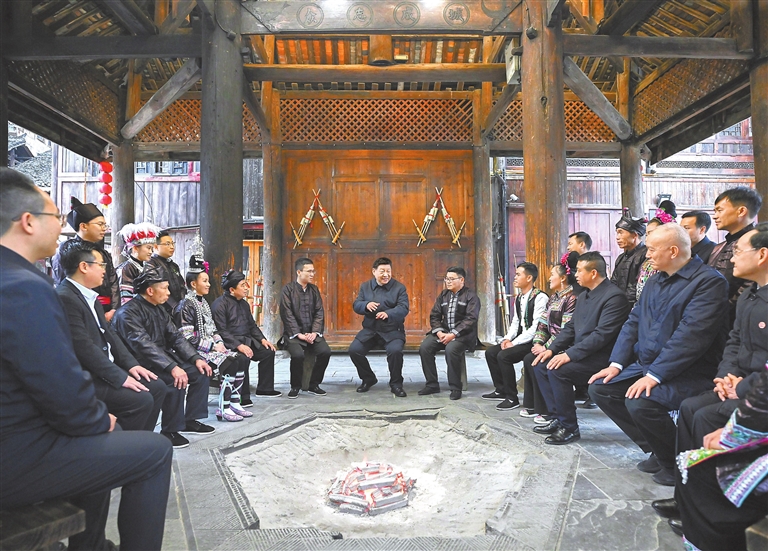 在信团鼓楼,习近平同村干部和村民代表围坐一起亲切交流。大家争相向总书记讲述近年来村寨发生的可喜变化。习近平表示,看到侗寨保护得这么好,侗族群众生活幸福,感到很欣慰。他指出,办好老百姓的事,关键在于加强农村基层党组织建设,发挥党支部战斗堡垒作用和党员先锋模范作用,带领群众发展经济、搞好乡村治理。