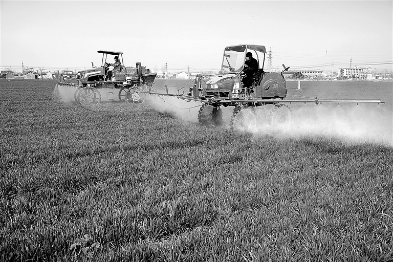 3月19日,在山东省枣庄市市中区税郭镇三屯村,农机手驾驶农机在田间为小麦喷施叶面肥。
