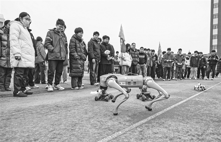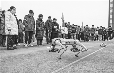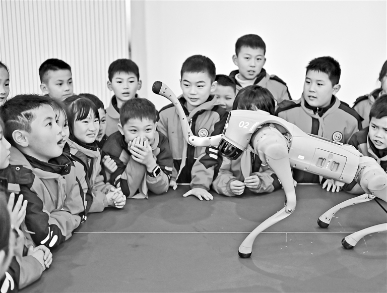 近年来,抚州市临川区定期组织科普宣传员进校园开展机器狗讲解展示等活动,为学生提供更多体验前沿科技的机会。图为3月13日,临川区第五实验学校人工智能科技小课堂上,学生在观看仿生四足机器人表演。