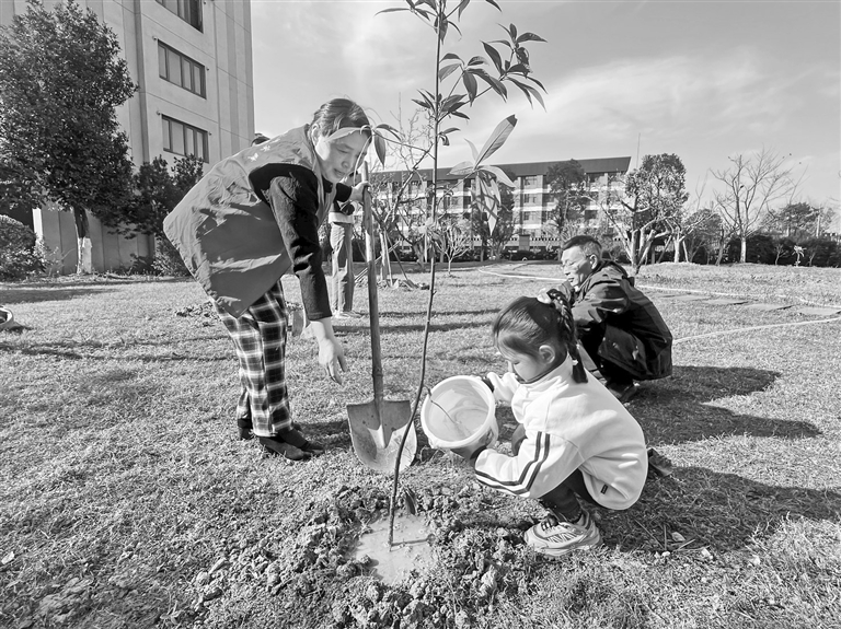 3月18日,南昌经开区蛟桥街道知爱社区在和正智汇谷小区开展义务植树活动,社区志愿者和小区居民共栽种枇杷树、柿子树等树苗50棵。通讯员 尹丽丹摄
