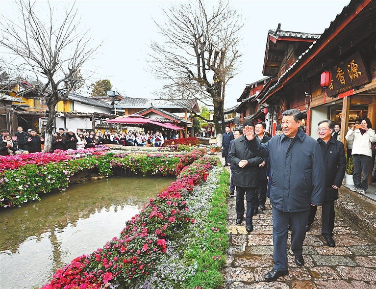 丽江古城有800多年历史,被列入世界文化遗产名录。一场春雪过后,丽江游人如织。习近平来到这里,详细了解古城营建历史、纳西族民居特色和当地文化遗产保护利用、推动文旅融合发展等情况。居民和游客见到总书记十分兴奋,争相问好,有的还弹奏乐器、载歌载舞欢迎总书记。习近平频频与大家互动交流,了解商铺经营状况和游客感受。他要求当地处理好保护和发展的关系,让这座美丽的古城焕发新的光彩。