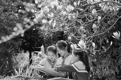 3月18日,上高县锦阳小学老师把美术课搬到玉兰花丛中,孩子们兴奋地用画笔描绘多彩春光。