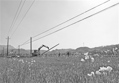 连日来,国网江西省电力公司贵溪市供电分公司道源供电所对责任地区农村电网进行改造升级。图为3月18日,鹰潭市龙虎山风景名胜区上清镇泉源村,工作人员正在架设电线杆。