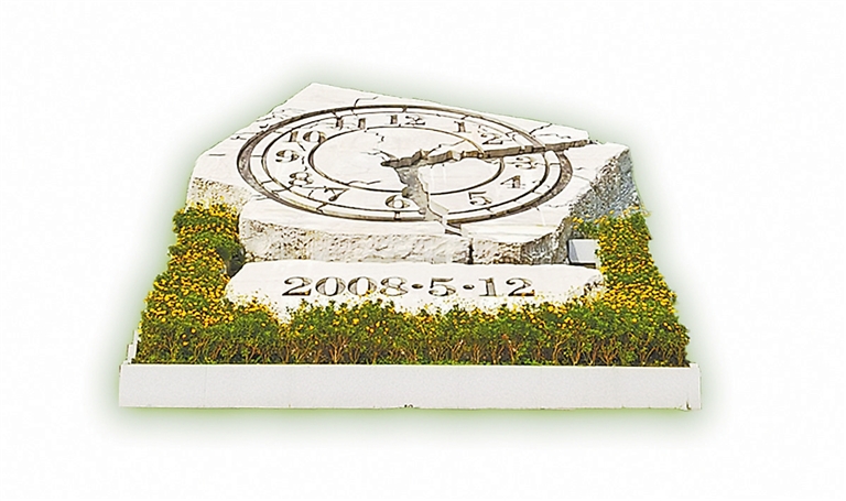 漩口中学5·12地震遗址前,一面用汉白玉和花岗岩雕刻的巨大时钟,屹立于废墟之上,它以地震时漩口中学高二(三)班教室里摔裂的时钟为原型,将2008年5月12日14时28分永久地凝固在震中映秀镇,被称为“汶川时刻”。汉白玉表盘上的裂纹,仿佛在默默地提醒每个人不要忘记山崩地裂的那一刻,不要忘记那些在灾难中逝去的人们,也警醒着生者,要带着对往昔的缅怀,勇敢前行。