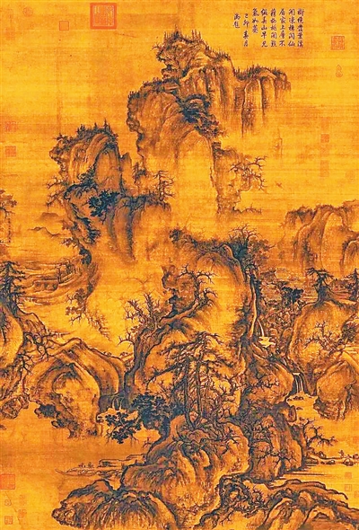 《早春图》展现了早春时节的山中风光。画面中,大地回暖,山间轻雾缭绕,远山巍峨挺立,近景山石嶙峋。泉水潺潺而下,汇聚于河谷,桥路楼观隐匿于山崖与树木之间。山石林木姿态万千,疏密有致。作品右上角的清乾隆题诗“树才发叶溪开冻,楼阁仙居最上层。不藉柳桃闲点缀,春山早见气如蒸”,为我们理解作品的意境提供了帮助。