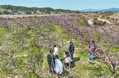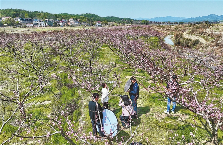 广昌县头陂镇羡地村发展庭院经济,村民认购管理桃树,实现春有烂漫桃花、夏有甜蜜果实。图为3月20日,游客在羡地村的桃园里打卡拍照。本报全媒体记者 徐 铮摄
