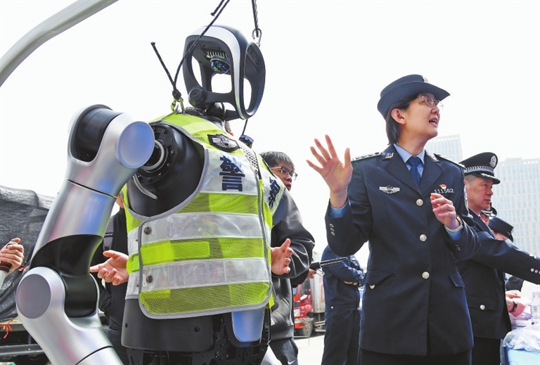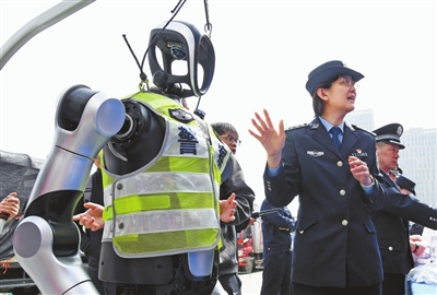 3月24日,一台具备引导和语音交互功能的警用机器人亮相青岛市流动人口服务管理宣传周启动仪式,与现场群众互动,回答人们咨询的问题。