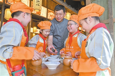 3月24日,南昌市东湖区大士院老街,南昌市豫章学校教育集团豫章路校区同学们在南昌瓦罐煨汤制作技艺省级代表性传承人余绍武指导下,学习、体验瓦罐汤的制作。
