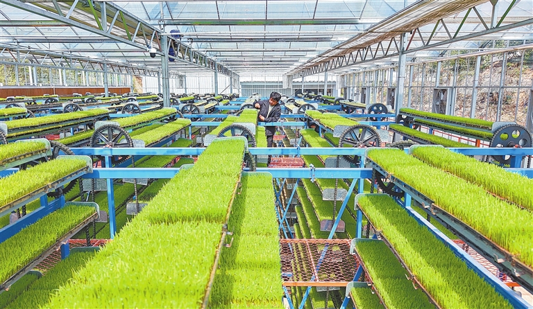 近年来,赣州市赣县区全力推行全过程农业机械化、自动化作业,为春耕生产注入科技动能。图为近日,赣县区南塘镇工厂化智慧育秧中心内,工作人员正在查看秧苗抽穗情况。特约通讯员 朱海鹏摄