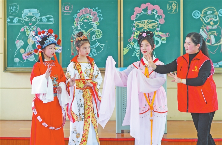 3月25日,在江苏省泰州市姜堰区城西学校教育集团城西小学校区,戏曲老师指导学生练习戏曲基本动作。世界戏剧日临近,各地中小学展开戏剧文化进校园活动,让学生们感受传统戏剧文化的魅力。新华社发(周社根摄)