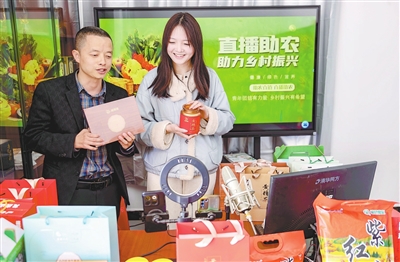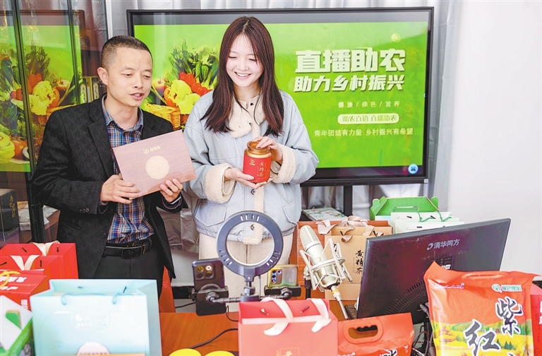 3月19日,在鹰潭市龙虎山景区上清镇城门村智慧农业综合运营中心,镇村干部正在直播推介特色农产品,助农增收。本报全媒体记者 徐 铮摄