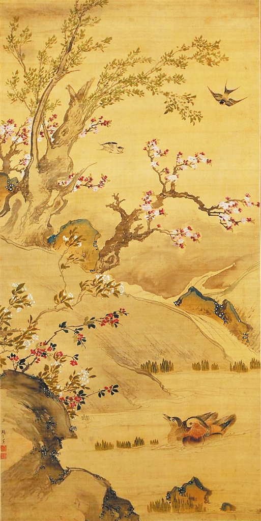 现藏于北京故宫博物院的明代画家周之冕的《双燕鸳鸯图》(如图),是一幅兼工带写的花鸟画,绢本,设色,纵186.2厘米,横91.2厘米。图中桃花盛开,花木间双燕翻飞,树下小溪潺潺、芳草萋萋,两只戏水鸳鸯相依相偎,呈现出杜甫“迟日江山丽,春风花草香。泥融飞燕子,沙暖睡鸳鸯”的诗意。