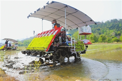 3月27日,全南县金龙镇东风村高标准农田里,农机手正在驾驶插秧机栽插水稻秧苗。