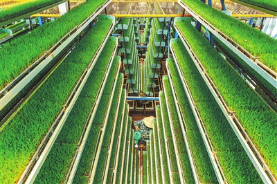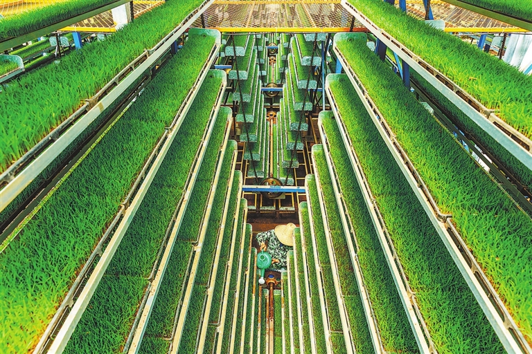 3月22日,吉水县醪桥镇黄牛洞立体育秧工厂内,工作人员正在为水稻秧苗浇水。 通讯员 刘志勇摄