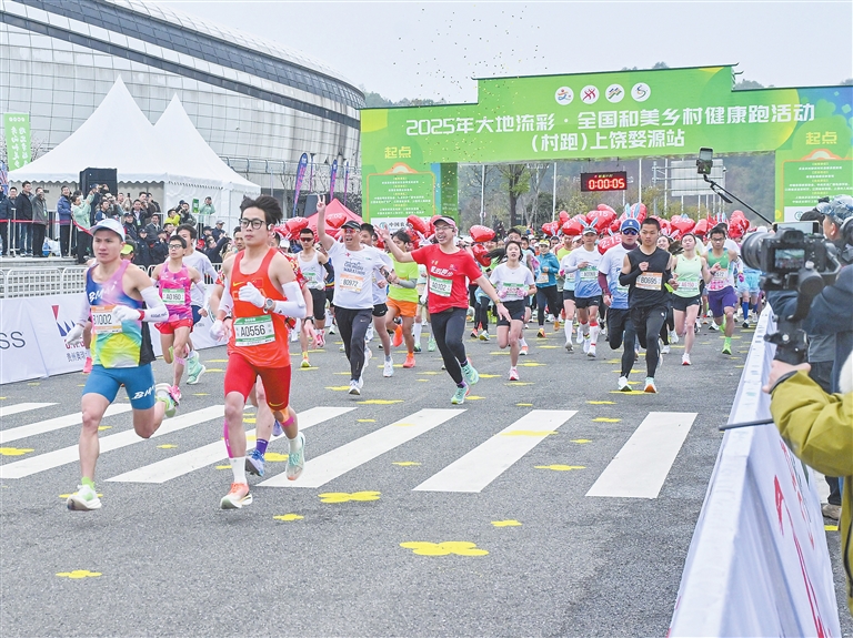 3月30日,2025年大地流彩·全国和美乡村健康跑活动(村跑)在婺源县开跑,5500名跑友从婺源体育中心出发,在油菜花海中感受村美民富的乡村图景。
