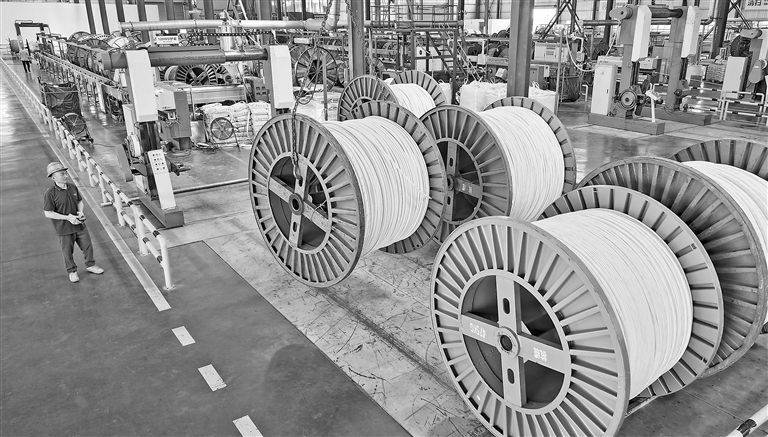 丰城市聚焦循环经济,打造从废料到产品的完整产业链。图为3月27日,位于该市循环经济产业园的江西杭缆电缆有限公司内,工人在生产车间操作设备吊装电缆盘。该公司电缆产品均由废弃物提炼而成。