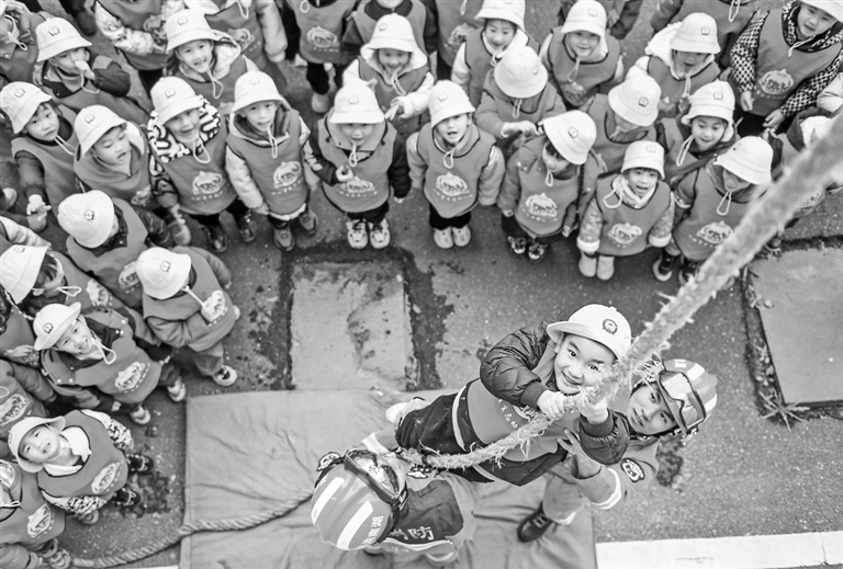 3月31日,在湖南省永州市道县消防救援大队,小朋友在消防救援人员的协助下体验绳索攀爬技能。