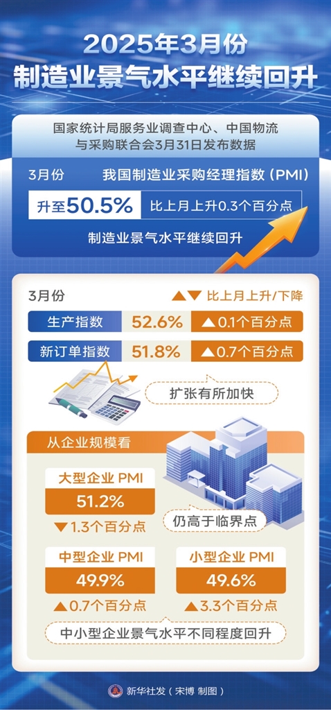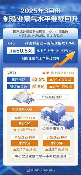国家统计局服务业调查中心、中国物流与采购联合会3月31日发布数据显示,3月份,企业生产经营活动加快,制造业采购经理指数(PMI)、非制造业商务活动指数和综合PMI产出指数分别为50.5%、50.8%和51.4%,比上月上升0.3、0.4和0.3个百分点。