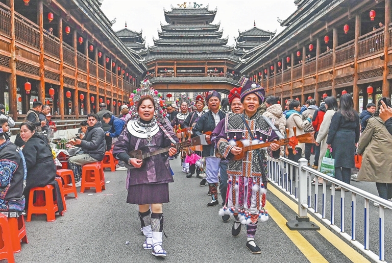 3月31日,在广西三江侗族自治县古宜镇举行的“三月三”庆祝活动上,侗族群众沿街表演。当日是农历三月初三,广西多地举行多彩活动庆祝“三月三”传统佳节。