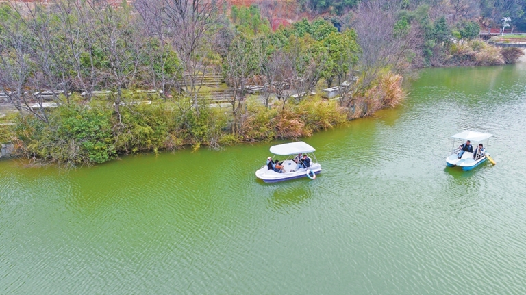 近日,庐山市海会镇山水忆恋生态园,游客乘着游船在湖中荡漾,放松心情,体验农家生活。