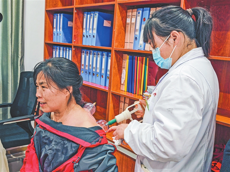 近日,广昌县建设西路社区联合县中医院举办“春日中医养生节”活动,宣传中医健康养生知识,提高居民健康意识和自我保健能力。图为3月20日,居民正在体验中医拔罐。