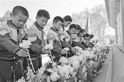 4月1日,在位于石家庄市的华北军区烈士陵园,学生为革命英烈敬献鲜花。