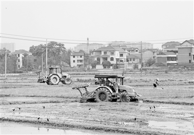 3月26日,在泰和县塘洲镇东湖村,农民驾驶农机翻耕整地,准备播种早稻。