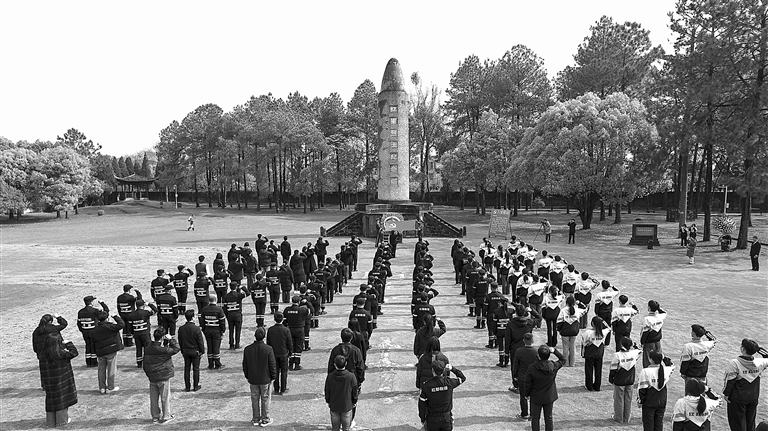 图①:4月1日,共青团瑞金市委在叶坪景区红军烈士纪念塔前组织开展清明祭英烈活动,深切缅怀革命先烈。刘新权摄