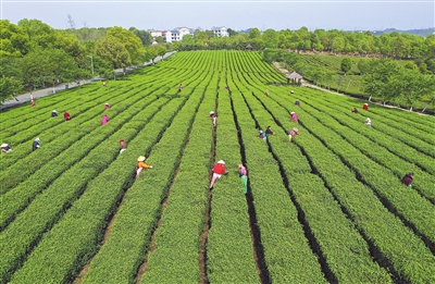 4月1日,上饶经开区董团乡境内的远泉茶业有限公司茶叶基地,茶农们抓紧采摘春茶。通讯员 艾世民摄