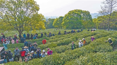 4月1日,在庐山市海会镇东林雨露三叠泉基地,当地茶企举办茶文化摄影比赛,吸引众多摄影爱好者走进茶园创作。特约通讯员 韩俊烜摄