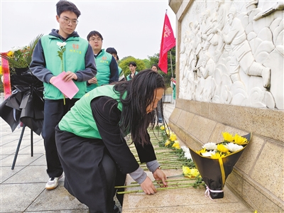 4月4日,宜春市微爱公益发展中心、宜春学院政法学院组织市民、学生前往宜春市烈士公园,开展“赓续·2025·清明祭英烈”活动,缅怀革命先烈,赓续红色血脉。图为宜春青年志愿者向革命烈士纪念碑敬献鲜花。本报全媒体记者 邹海斌摄