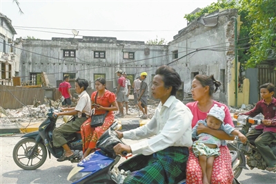 4月4日,行人骑摩托经过缅甸皎施的一处建筑废墟。据缅甸广播电视台3日报道,缅甸强震目前已造成3145人死亡、4589人受伤,另有221人失踪。 新华社/法新