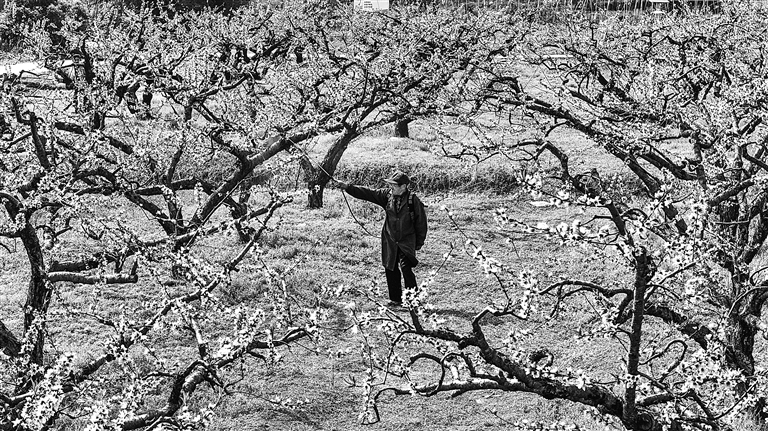 4月1日,南丰县桑田镇古城村前湖庄园里桃花盛开,果农正在进行桃园管护。