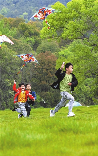 ◀4月4日,孩子们在新余市仙女湖区仰天岗办事处宽心小镇踏青放风筝,乐享假日好时光。