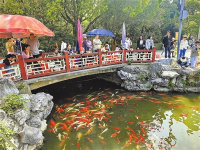 ▲4月6日,游人在南昌市人民公园观赏锦鲤,放松心情。