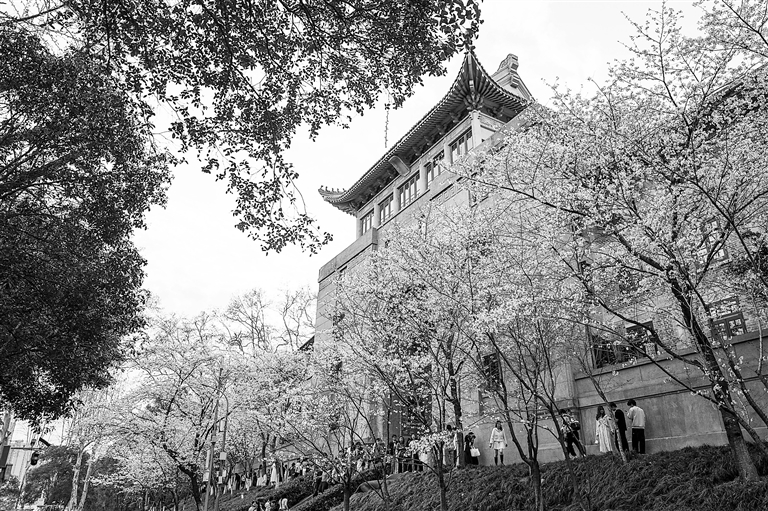 ▲3月22日,游客在武汉大学赏樱。