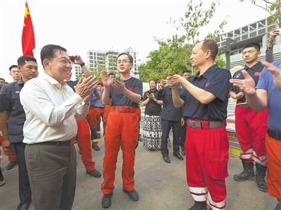 4月6日,在缅甸曼德勒中国救援队伍营地,缅甸领导人敏昂莱(前左一)慰问中国救援队伍。当日下午,缅甸领导人敏昂莱来到曼德勒中国救援队伍营地慰问中国救援队、由中国军队参与组派的中国国际救援队、中国香港特区救援队全体成员,对中方救援队伍震后到缅全力救援表示感谢。截至4月6日,中国救援队伍在缅甸共搜救出9名幸存者。新华社记者 才 扬摄