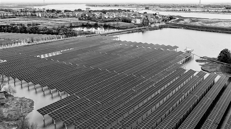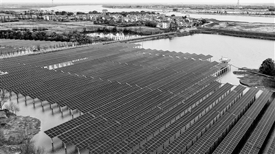 ▲近年来,南昌县巧用本地水库、鱼塘,因地制宜发展渔光互补光伏发电项目。图为近日,该县塔城乡100兆瓦渔光互补光伏发电项目现场,连片的光伏电板紧密排列。